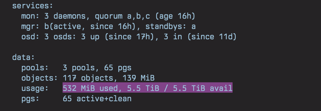 A terminal export with the notable line: 523 MiB used, 5.5 TiB / 5.5 TiB avail