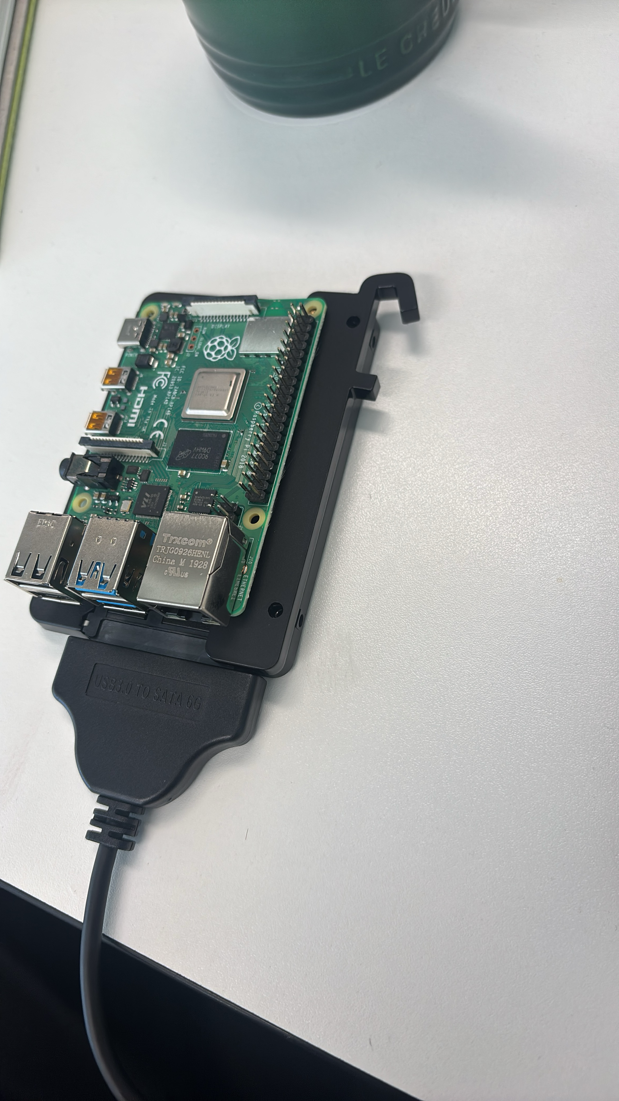 A raspberry pi + internal SDD with a custom laser cut hook holding them together