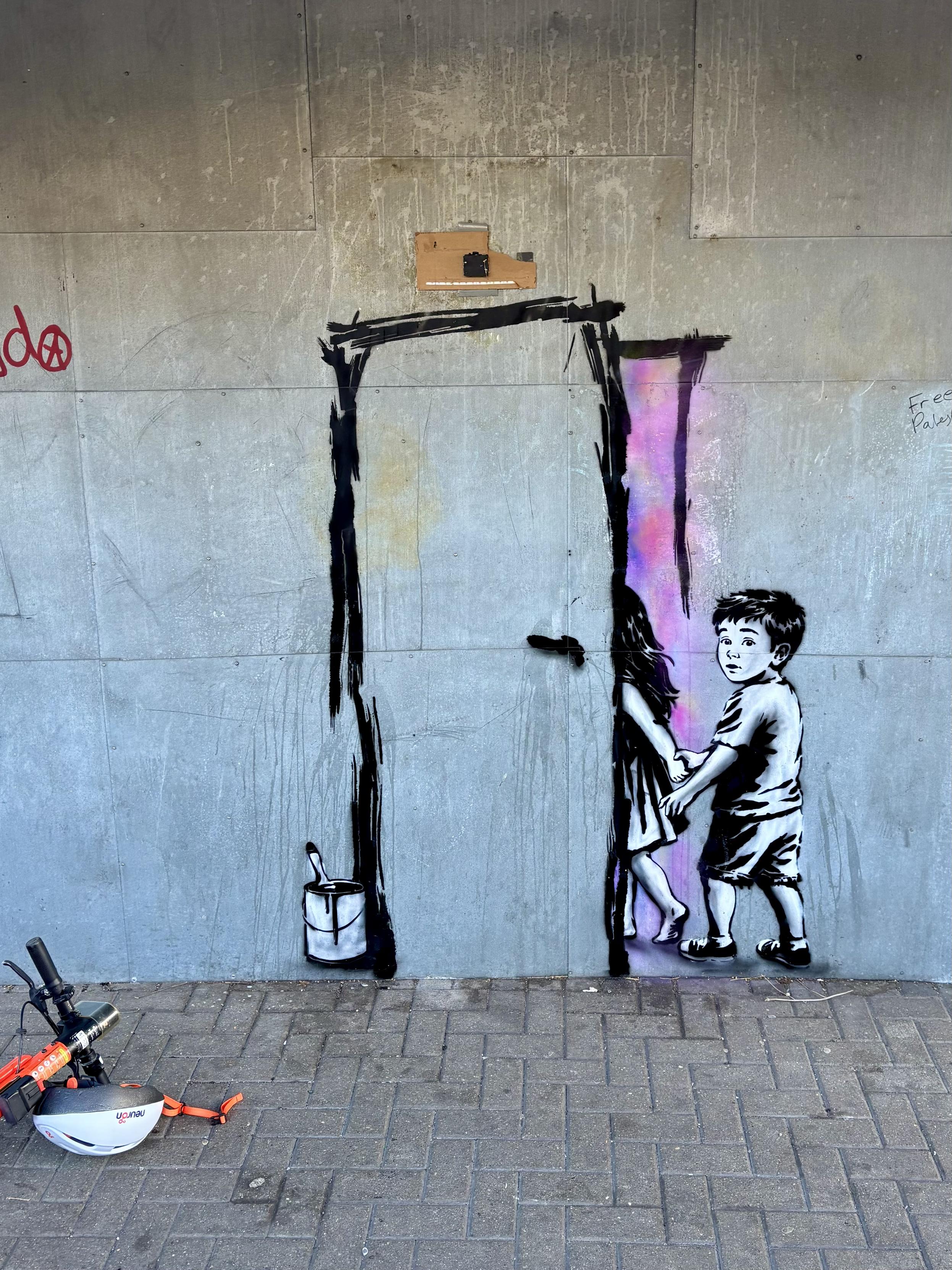 A door painted on a concrete wall with two children walking through to somewhere exciting