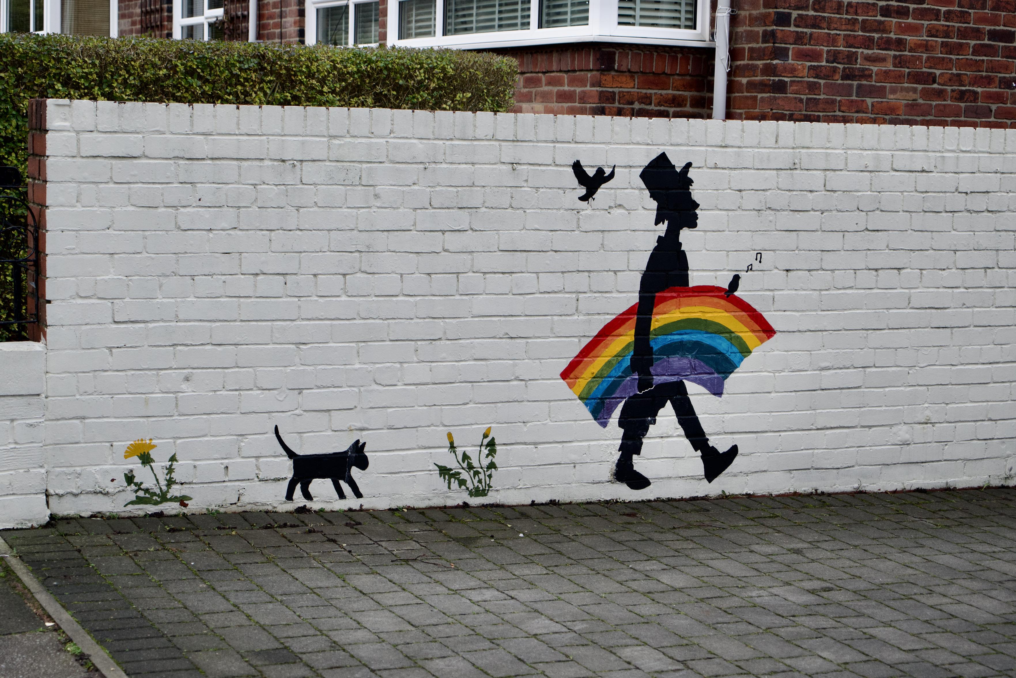 A silhouette of a man carring a rainbow on a white wall being followed by a cat
