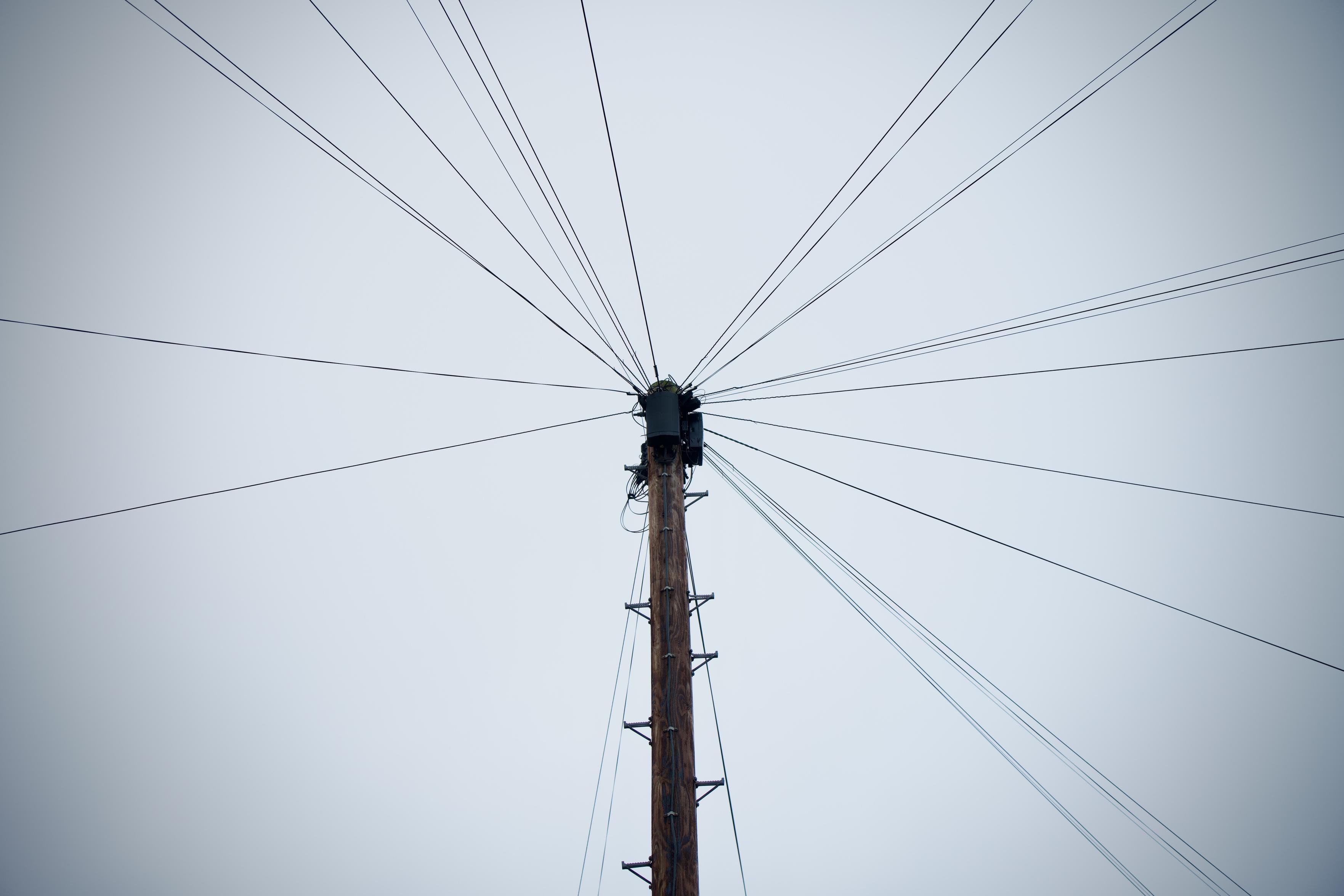 A telegraph pole against a white sky with many wires travelling away in all directions
