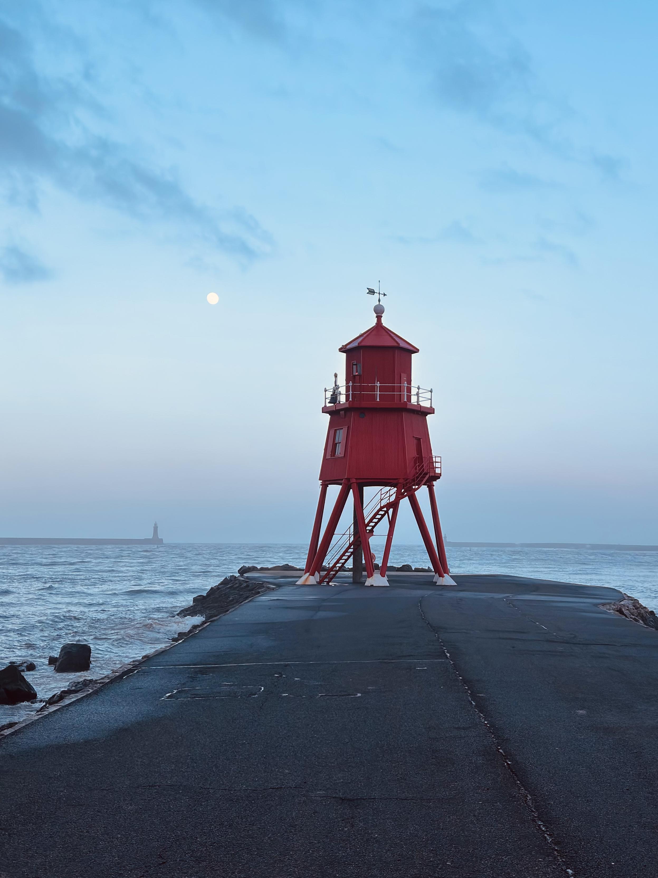 A stark red stilted lighthouse at the end of the concrete pier